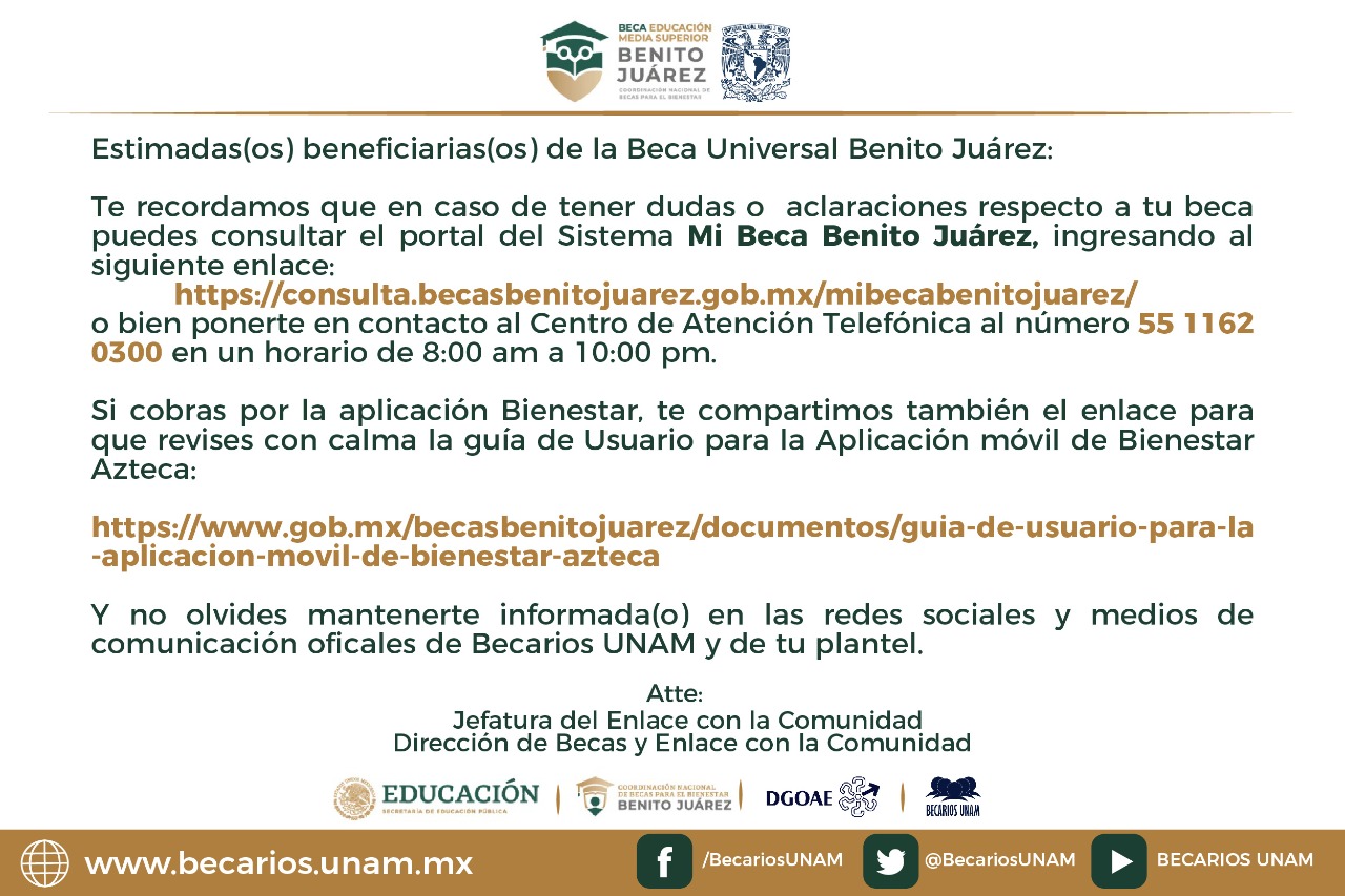 Beca Benito Juárez Bachillerato UNAM Ciclo 2021 – 2022 Infografía Guía para registo y pago App Azteca Formato de renuncia Sistema Mi Beca Benito Juárez
